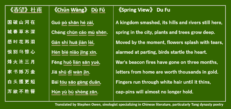 Source Wikipedia including details about the structure, genre and context of the poem. Translation by Stephen Owen, American sinologist specializing in Chinese literature, particularly Tang dynasty poetry and comparative poetics. He taught Chinese literature and comparative literature at Harvard University.