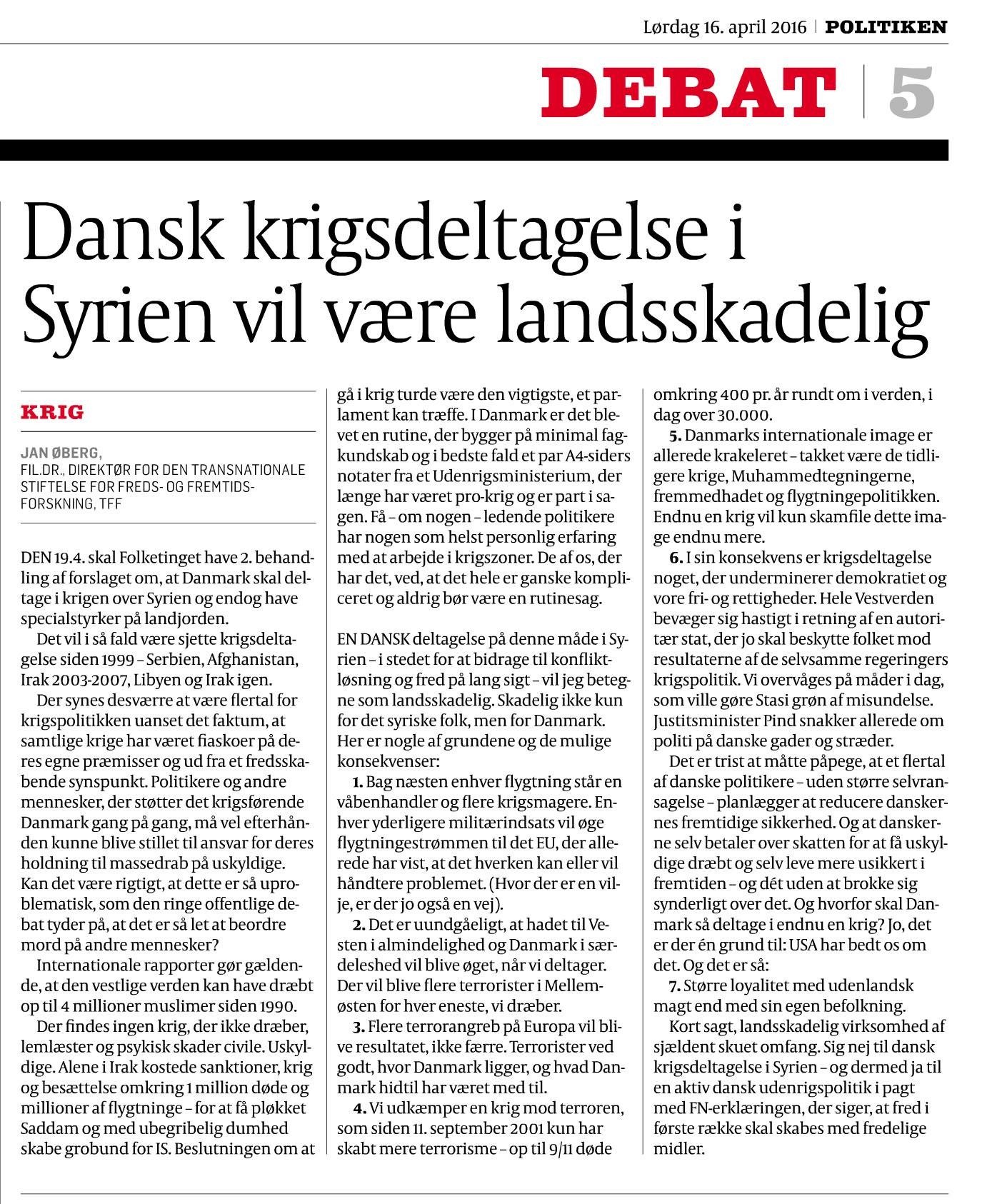 1. Dansk krigsdeltagelse i Syrien vil være landsskadelig