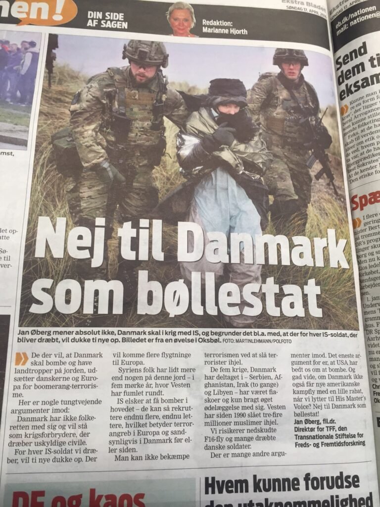 Ritzaus Bureau meddelte onsdag aften den 13. april – 6 dage før folketingets beslutning – at forsvarsminister Peter Christensen vil tillade at danske F16-fly bomber – og dræber – civile i kampen mod ISIS; han understreger dog “at de danske flyangreb fortsat vil foregå “i overensstemmelse med folkeretten” men at “civile tab skal vejes op mod den militære nødvendighed.”