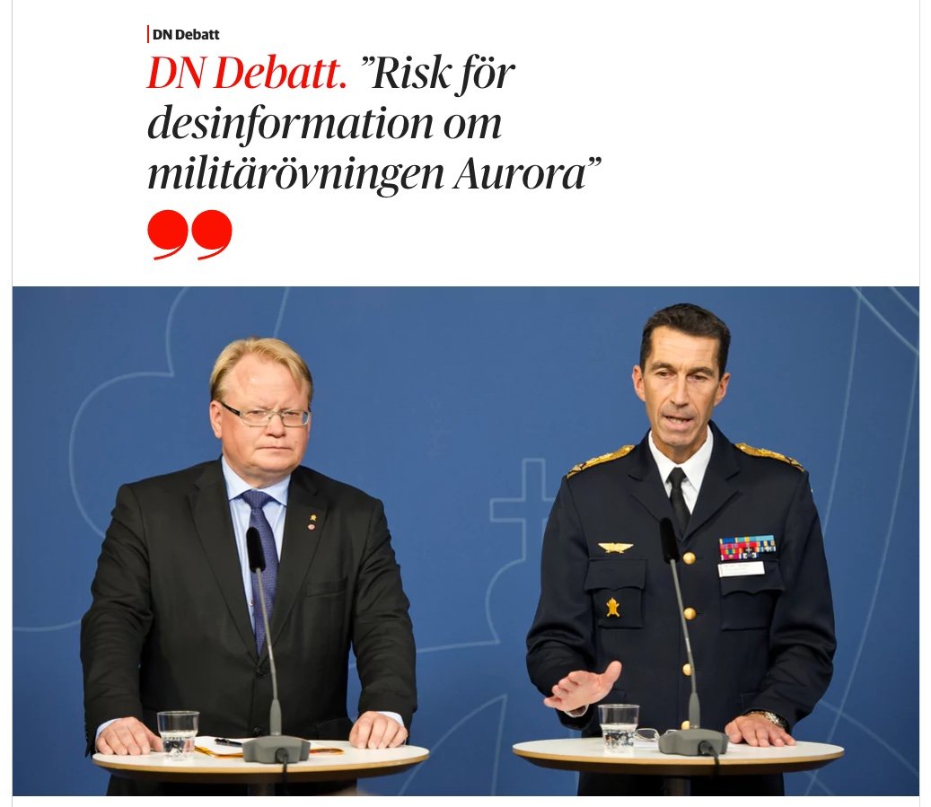 Försvarsminister Peter Hultqvist och ÖB Mikael Bydén hävdar i sin DN-artikel den 15 maj att det finns uppenbar risk för påverkans- och informationsoperationer i anslutning till höstens militärövning Aurora 17, den största övningen på 24 år, med deltagande av sex NATO-länder och Finland.