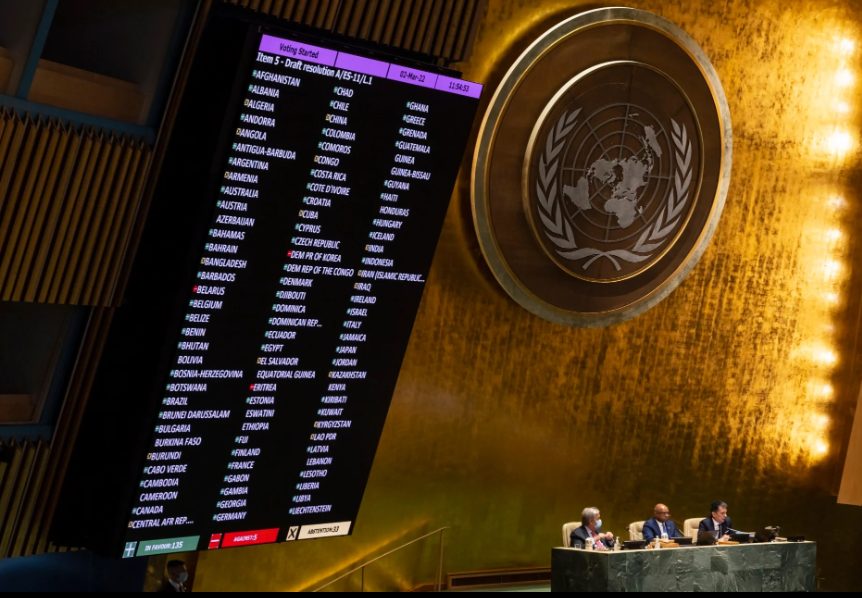 A screen shows results from a vote on a resolution condemning Russia’s invasion of Ukraine, during an emergency session of the United Nations General Assembly in New York, on March 2, 2022. Photo: EPA-EFE