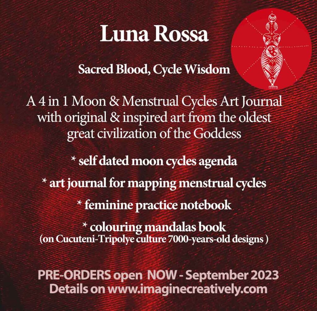 Luna Rossa: Sacred Blood, Cycle Wisdom – an art journal and peace offering – publication. Here is the pre-order campaign and free online events on feminine health & power themes with a deep cyclical understanding of how inner and outer peace can combine..