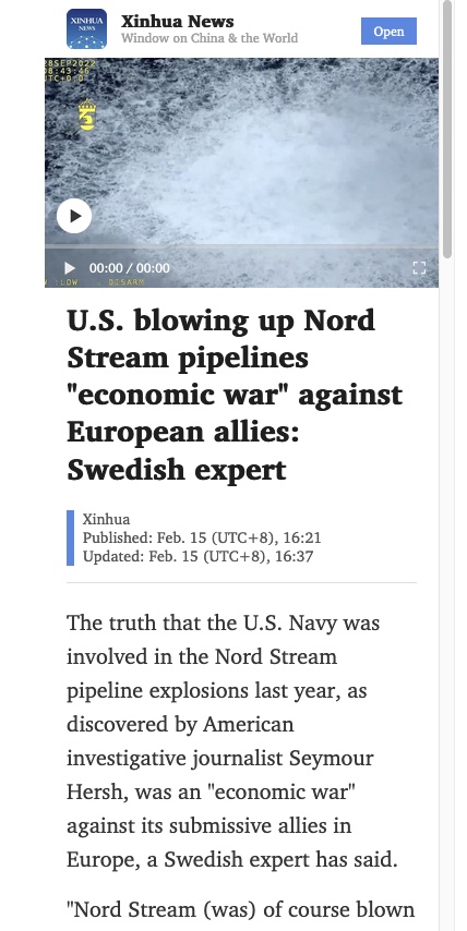 The Chinese news agency, Xinhua, asked me to comment – in text and video form – on Seymour Hersh’s analysis of how the Nordstream pipelines were destroyed. You’ll find this analysis on Substack, which means that no American mainstream media has been willing to publish it. After five days, this bombshell report goes virtually unmentioned in the Western mainstream press. Imagine if he had documented that Russia did it…