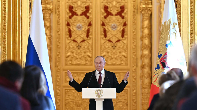 File photo: Russian President Vladimir Putin delivers a speech during a meeting with election campaign workers at the Grand Kremlin Palace, in Moscow, Russia. © Grigory Sysoev / Sputnik