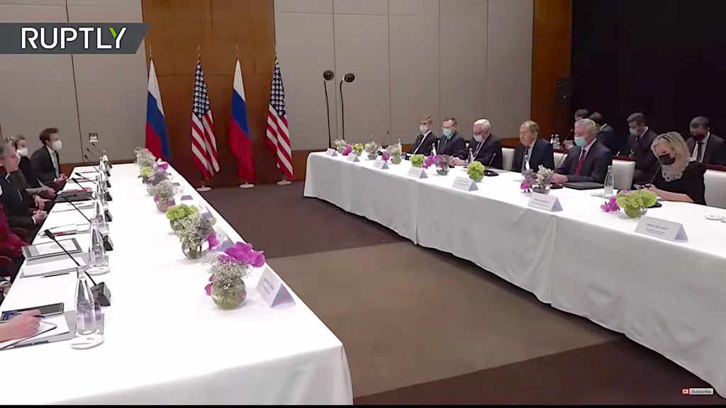 Public opening session between Lavrov and Blinken on Friday. (Ruptly screenshot.)