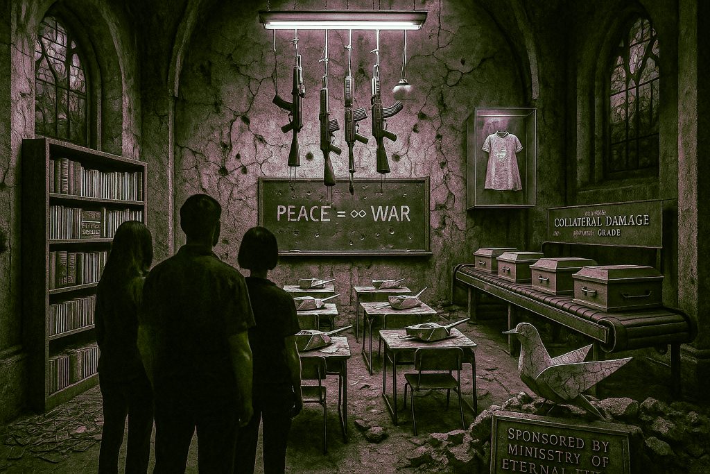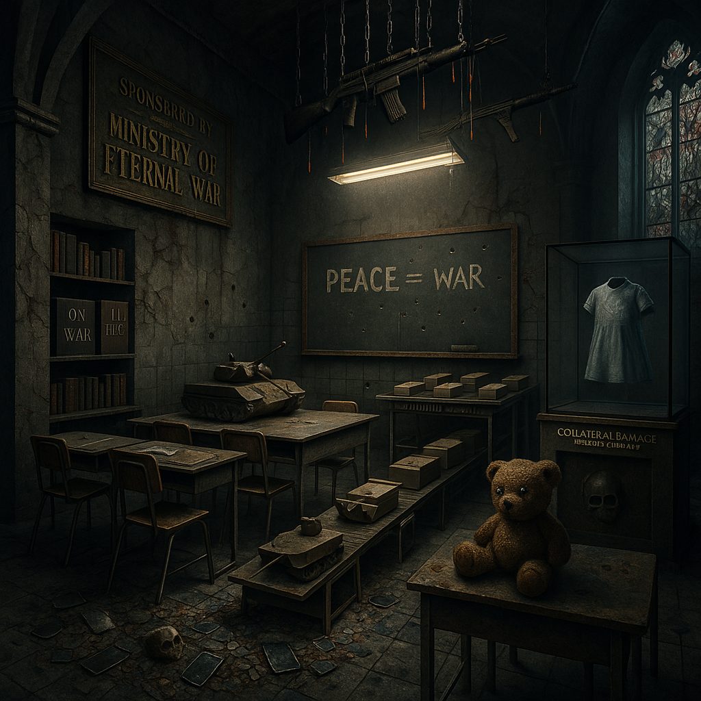All images are AI-generated by the author, a couple of them part of a series on “The Museum of The Ministry of Eternal Warfare.”