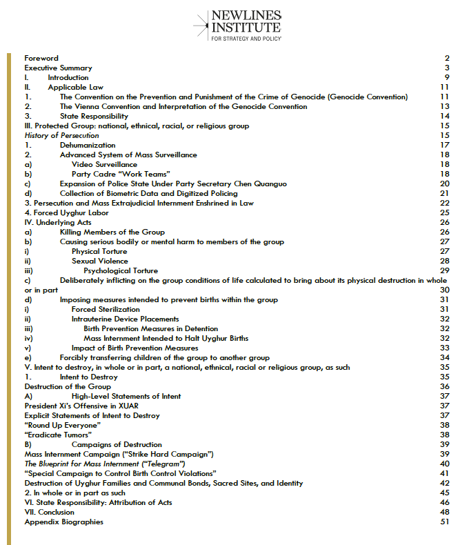 It states that ”This report is the first independent expert application of the 1948 Genocide Convention to the ongoing treatment of the Uyghurs in China. It was undertaken by the Newlines Institute for Strategy and Policy, in cooperation with the Raoul Wallenberg Centre for Human Rights, in response to emerging accounts of serious and systematic atrocities in Xinjiang province, particularly directed against the Uyghurs, an ethnic minority, to ascertain whether the People’s Republic of China is in breach of the Genocide Convention under international law.”