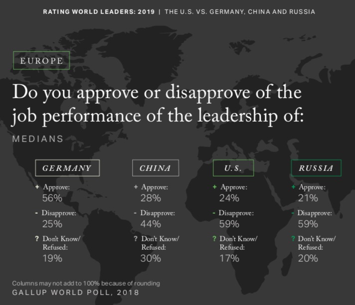 You can find a lot of very interesting and precise poll results for the period 2007-2018 pertaining to all the world’s regions in the report, “American First?” Rating World Leaders: 2019.